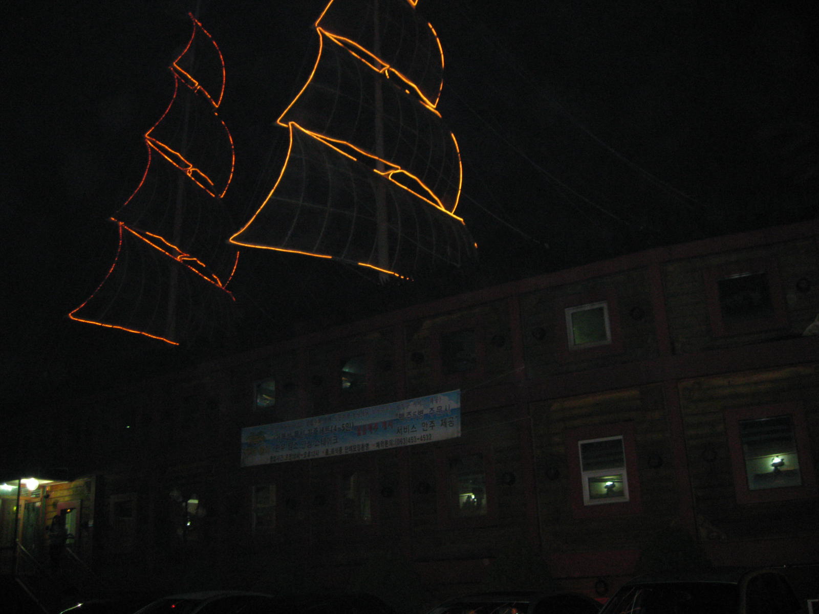 I had dinner with the minister of the church and my friend from church, Sungwha. You can say it was my thanksgiving and birthday dinner bought by the minister. These are pictures of where we ate, it was a big boat with these lit up sails and it had a dragon head. On the inside we sat on couches and it was decorated like the inside of a boat. The food was pretty cool too, complete with soup, salad, and a fried steak covered in many sauces. I also took a picture of their meals, which was octopus, rice and vegetables.
